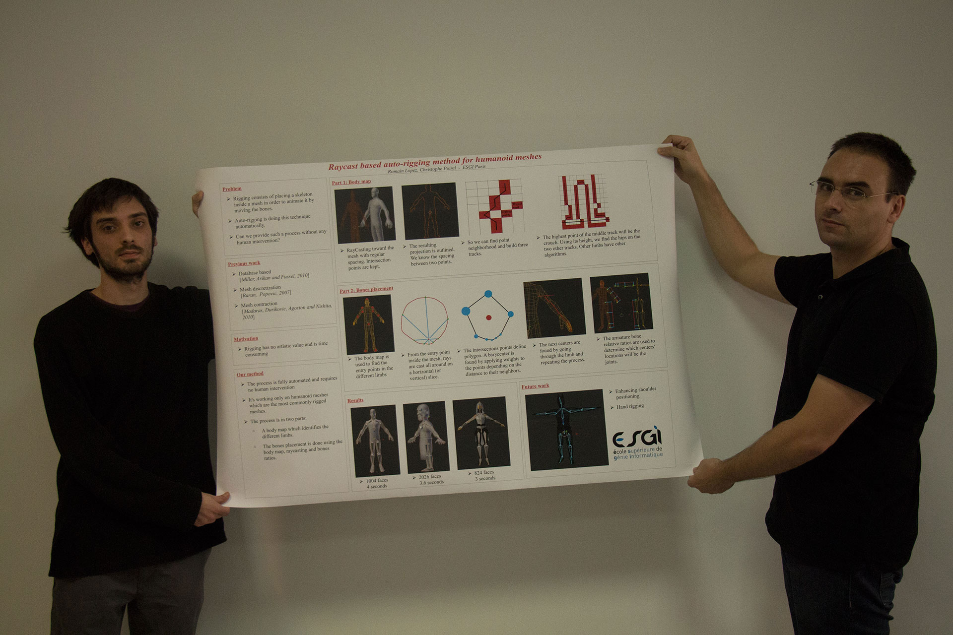 Christophe Poirel et Romain Lopez, deux étudiants de la spécialisation Ingénierie de l’Image et des Jeux Vidéo y sont invités pour y présenter leur projet développé au sein de l’école sur le thème de « Raycast based auto-rigging method for humanoid meshes », un projet soutenu depuis le début par le laboratoire 3D et Jeux vidéo de l’ESGI et son animateur Alain Lioret.
