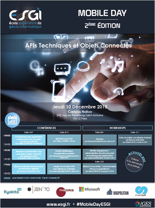 Jeudi 10 décembre dernier, dans les locaux du Campus Nation à Paris, les étudiants de l’ESGI, les anciens et les passionnés ont pu profiter d’une journéede conférences et de workshops entièrement dédiés aux plateformes mobiles et à l’IoT, avec un accent tout particulier mis sur les objets connectés.